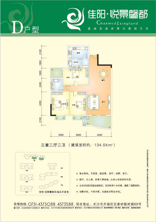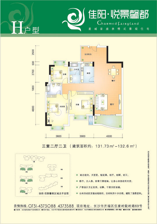 佳阳.悦景馨都位处开福区伍家岭陡岭路69号,总建筑面积为13万平方米,为电梯小高层洋房社区,总规划户数为930户,主力户型有二房二厅丶三房二厅丶四房二厅,户型面积从90-156平方米不等。项目毗邻陡岭路(30米城市次干道)南衔丽臣路,东连环线丶机场高速,西引伍家岭立交桥丶芙蓉路丶湘江二桥。有多条公交巴士线路停靠。交通网络四通八达。