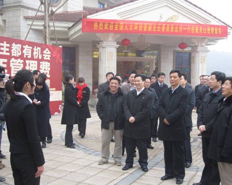 2月24日上午11时许,全国人大环资委副主任委员张云川、王庆喜及全国人大常委会委员、全国人大环资委委员张兴凯贵宾一行莅临碧桂园•山水桃园现场。碧桂园湖南/重庆区域总裁黎晓林先生、碧桂园•山水桃园项目总经理龚小平先生以及碧桂园•山水桃园全体工作人员于销售中心前坪热烈欢迎各位中央领导到来。在听取关山村村支部工作人员关于碧桂园•山水桃园项目概况,尤其是碧桂园•山水桃园项目入驻关山,积极参与大河西先导区人文居社区建设尤其是推进长沙城乡一体化、对农村土地集约利用方面相关情况之后。张云川主任表示:“新农村建设首要任务就是妥善利用与开发土地,关山村依靠房地产商业开发环节,按照现在的情况看来,确实充分实现了农村土地的合理利用。”