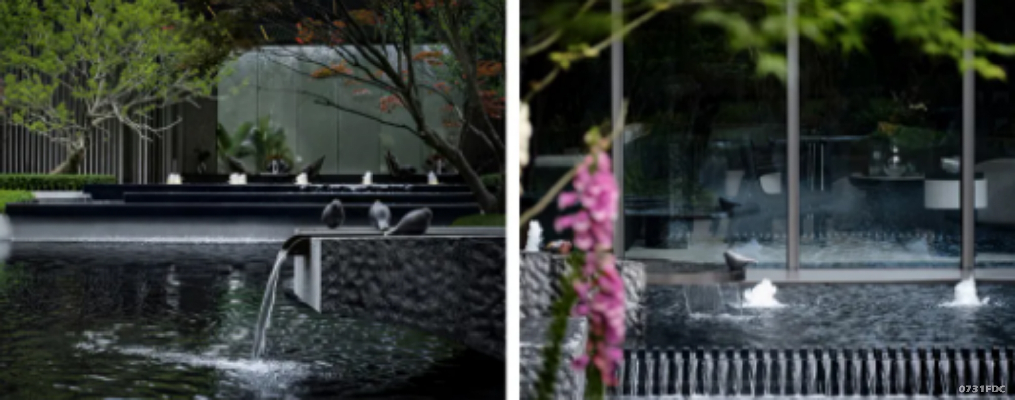 潺潺流水、简约檐角、错落花木等