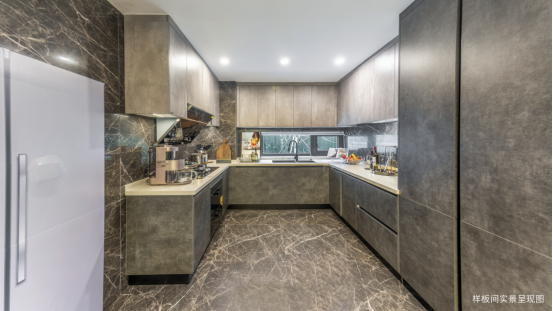 U型厨房,配置有方太抽油烟机、消毒柜、