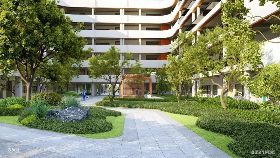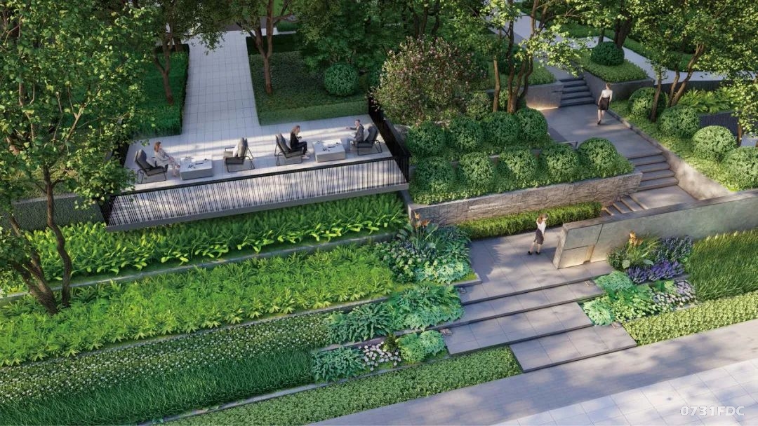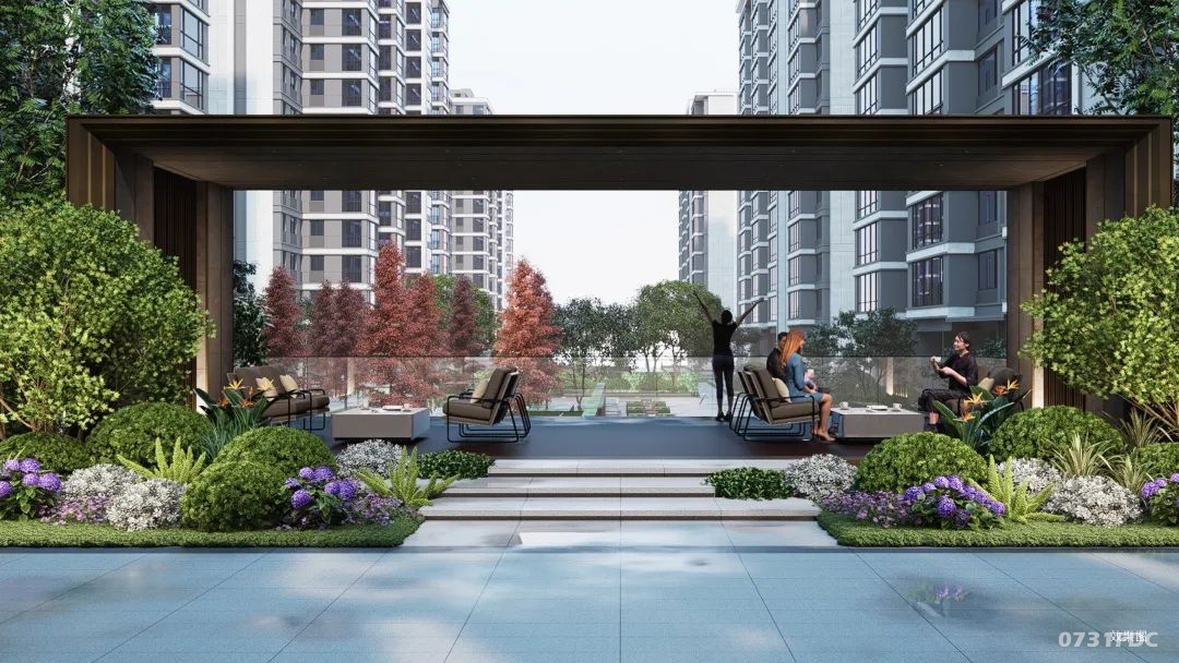 楼栋一侧紧邻社区入口的恢弘景观中轴线