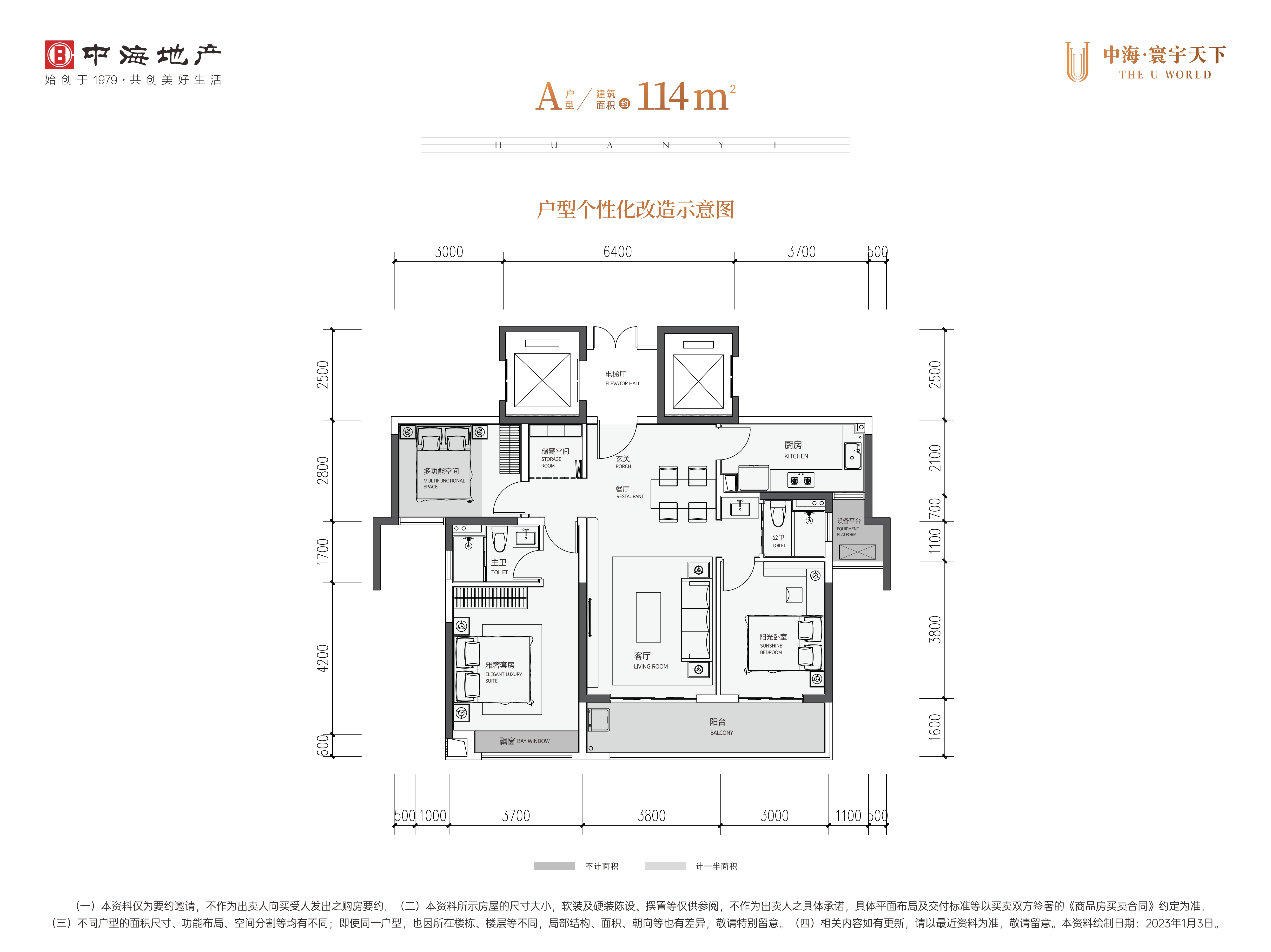 约114㎡2+1户型空间,设计3开间朝南采光,充分利用每一寸面积,不仅满足3卧阔绰起居配置,并开创性的打造了灵动储物空间,客户可以根据亲子、存储、爱好随心定制,满足菁英家庭更多生活需求。