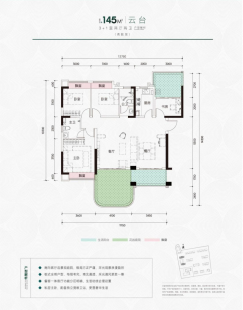 本案均为两梯两户或两梯一户的纯板楼设计,此次开放的145㎡的样板间更是做到了全明通透、布局考究、南北通透,采光及通风更胜同类产品一筹;餐客厅一体化,增加空间宽阔感,景观庭院设置在公区外,与南向阳台相连,减少空间浪费;且错落式庭院设计规避采光影响;动静分区,近20平奢阔主卧,空间宽敞舒适而不浪费。