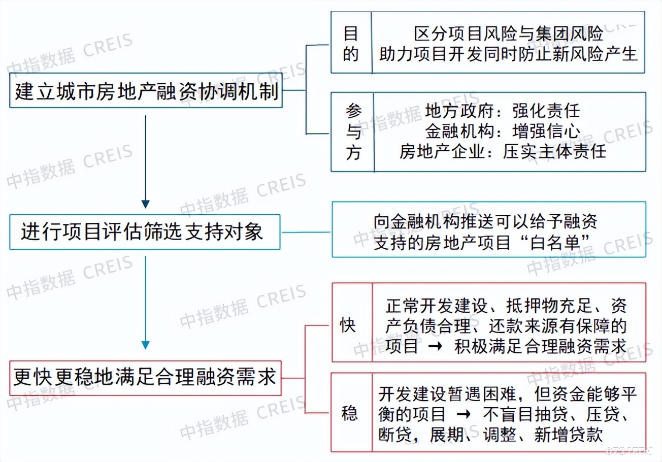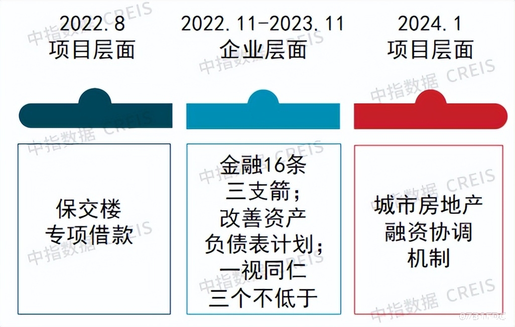 2024年,建立城市房地产融资协调机制,进一步支持房地产融资。2024年1月12日,住房城乡建设部、金融监管总局联合发布《关于建立城市房地产融资协调机制的通知》,要求各地级及以上城市建立房地产融资协调机制,搭建政银企沟通平台,推动房企与金融机构精准对接。1月26日上午,住房和城乡建设部召开城市房地产融资协调机制部署会,要求地级及以上城市人民政府要把这一重要机制迅速建立和运转起来,各地要以项目为对象,抓紧研究提出可以给予融资支持的房地产项目名单。融资政策体现对于项目与房企层面的双重支持,当前以项目层面为重点。